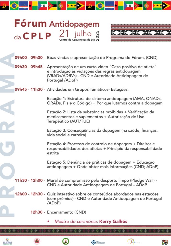 Preparasaun finál ba Fórum Antidopajen, ne’ebe sei hala’o iha loron Segunda-feira, 21 Jullu 2025, iha Centro de Convenções de Dili (CCD). Organiza husi Komisaun Nasional Desportu (KND) ho kolaborasaun ho Autoridade Antidopajen Portugal (ADoP), fórum ne’e sei halibur atleta, treinador, estudante no ofisiál desportu sira atu hametin Timor-Leste nia kompromisu ba desportu moos.